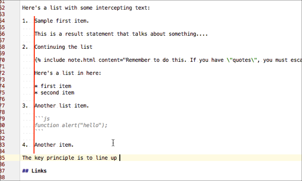 For the sake of simplicity, use two spaces after the dot for numbers 1 through 9. Use one space for numbers 10 and up. If any part of your list doesn’t align symmetrically on this left edge, the list will not render correctly. Also note that this is characteristic of kramdown-flavored Markdown and may not yield the same results in other Markdown flavors.
